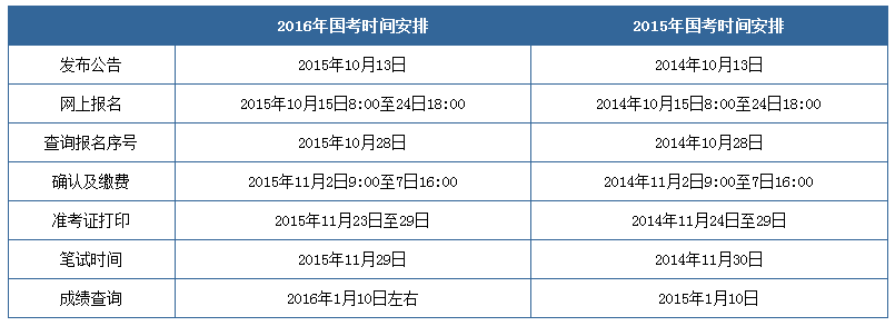 2017年国家公务员考试报名时间还未发布,根据往年时间预计在2016年10月中旬报名,2016年11月底笔试。一般情况下,2017年国考时间会与2016年国考基本一致,以下为近年国家公务员考试时间节点安排,仅供参考。