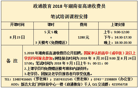 笔试时间为2018年9月1日上午9:00-11:00,考试地点以准考证为准。报考人员,请于2018年8月29日9:00至8月31日12:00自行登陆湖南省人事考试网下载并打印准考证。笔试成绩于2018年9月6日在湖南人事考试网上公布。
