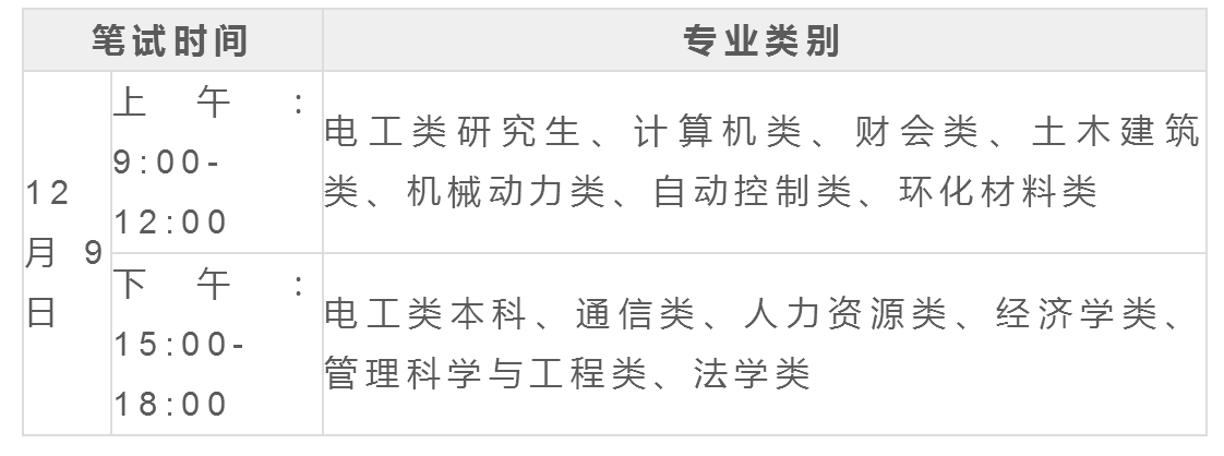 1.笔试时间、地点。12月9日,在国网湖南省电力有限公司技术技能培训中心进行。各专业具体考试时间安排如下: