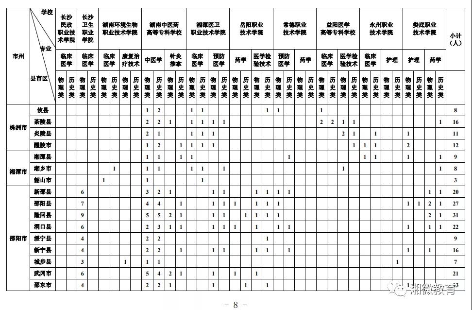 2021年,省级财政出资计划培养招生1000名,地方财政出资计划培养招生52名。省卫生健康委、省教育厅委托我省开设有医药卫生类专业的长沙民政职业技术学院、长沙卫生职业学院、湖南环境生物职业技术学院、湖南中医药高等专科学校、湘潭医卫职业技术学院、岳阳职业技术学院、常德职业技术学院、益阳医学高等专科学校、永州职业技术学院、娄底职业技术学院等10所全日制高职(专科)院校培养(以下简称培养学校)。根据区域卫生人才发展规划和重点支持已脱贫县的原则,省卫生健康委、省教育厅在综合平衡的基础上,编制了《2021年湖南省基层医疗卫生机构本土化专科层次人才培养分学校分类别分县市区招生来源计划表》。上述各院校招生计划均纳入本校年度招生总计划。 上述各培养学校本土化培养的学生按专业独立编班学习,纳入所属院系统一管理。临床医学、中医学、针灸推拿专业学生毕业后按照国家有关政策继续进行2年的助理全科医生、中医助理全科医生培训(即 “3+2”医学人才培育模式)。